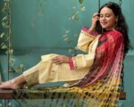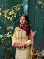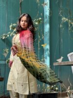 Kurti is made of Kashmiri cotton with embroidery work. Pant is made of Kashmiri cotton with hand block . The orna is made of semi pure georgette with Batik work.