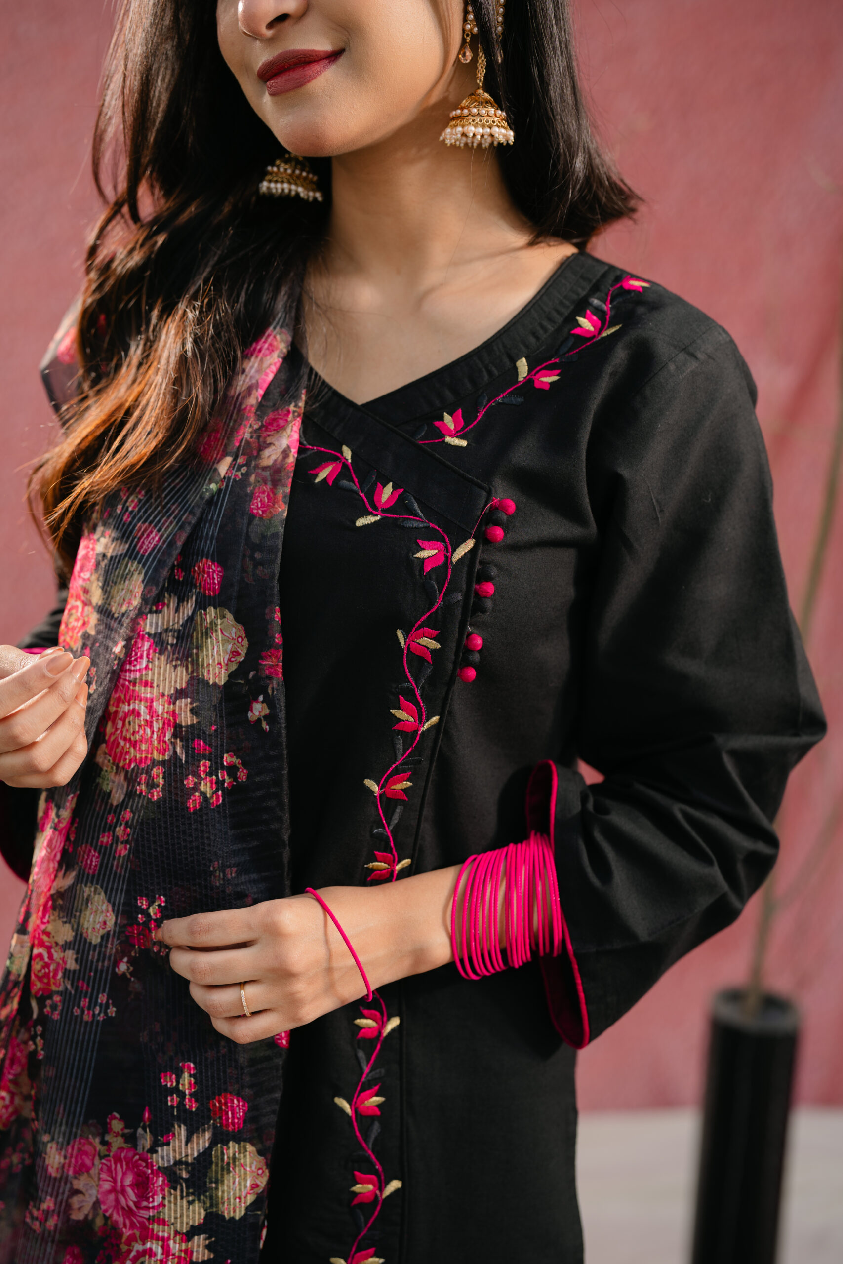 Kurti is made of Kashmiri cotton with embroidery work. Pant is made of Kashmiri cotton with embroidered work . The orna is made of Organza with digital print.