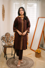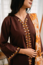 Kurti is made of Kashmiri cotton with embroidery work. Pant is made of Kashmiri cotton with embroidery work . The orna is made of silk cotton with digital print.