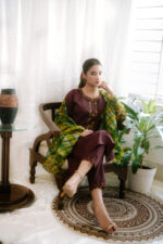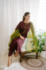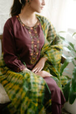 Kurti is made of Kashmiri cotton with embroidered sleeves and neck design. Pant is made of Kashmiri cotton with embroidered work . The orna is made of organza with Batik work.