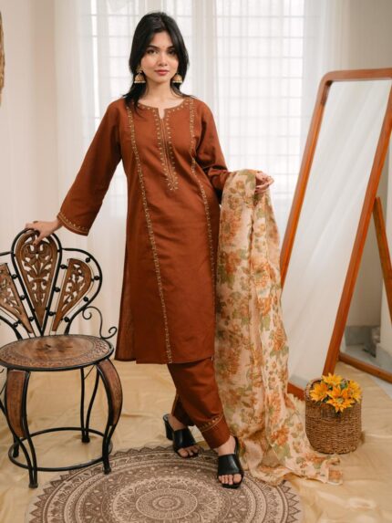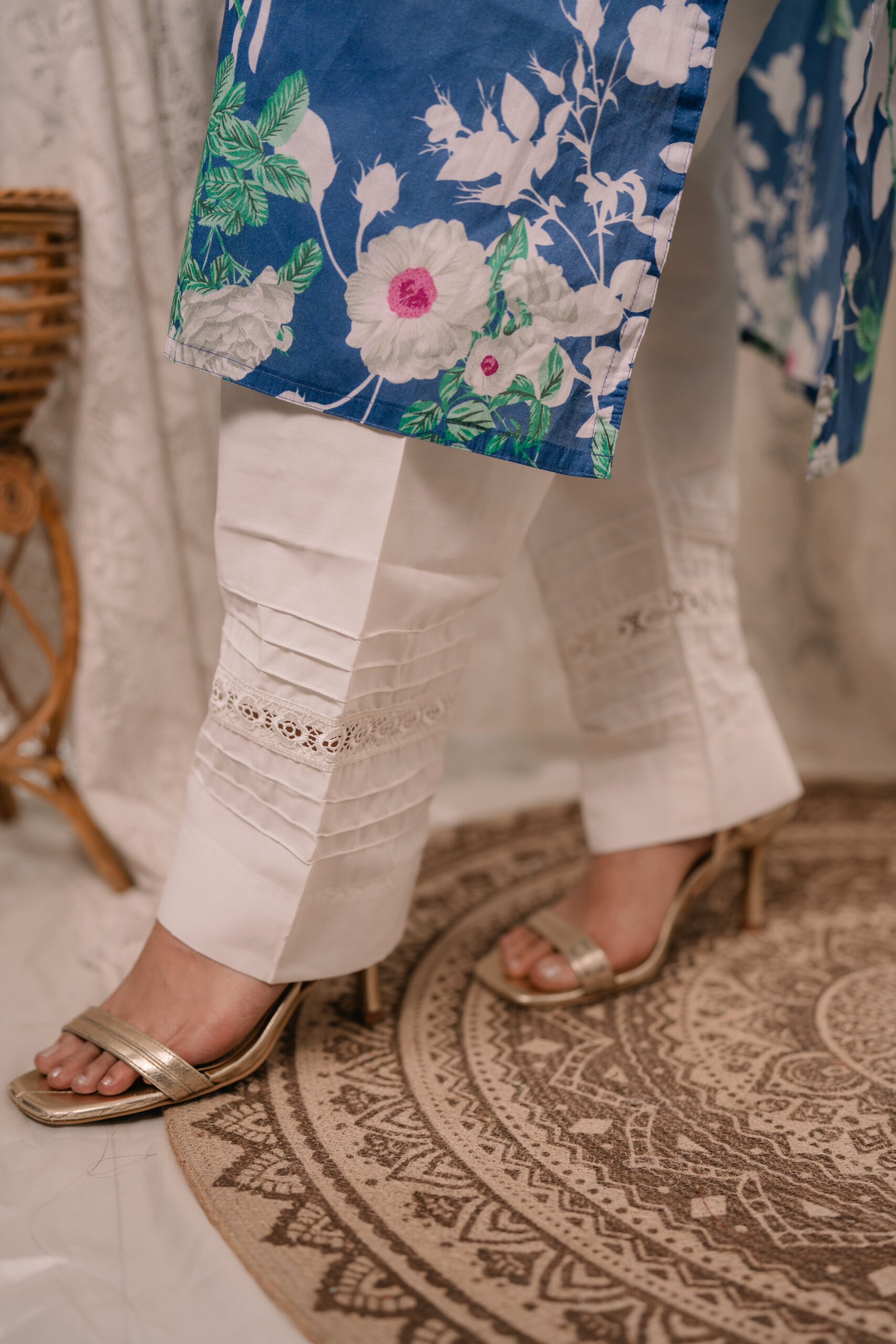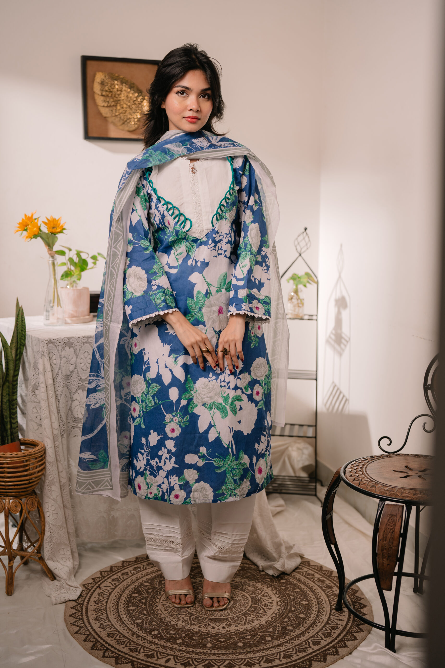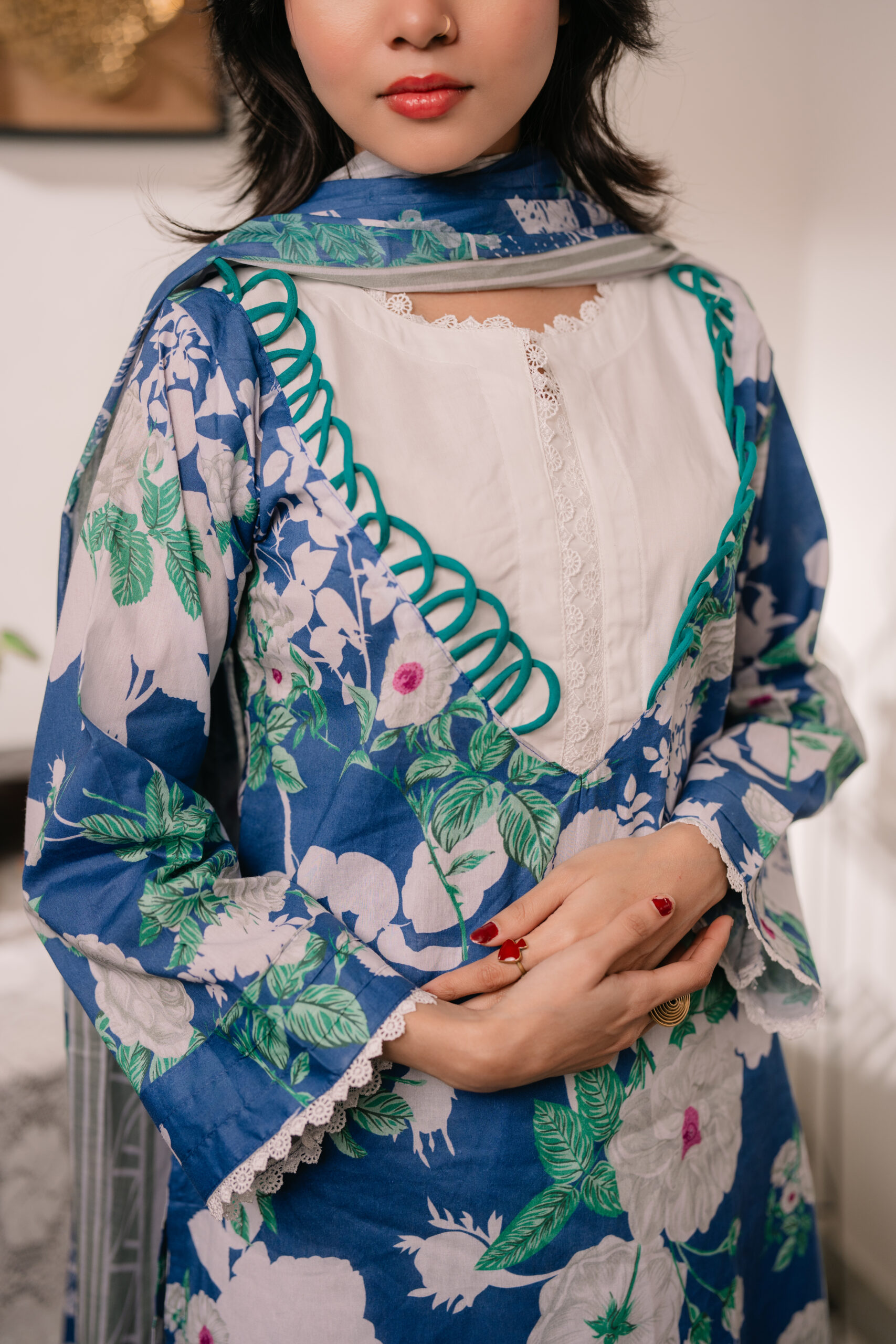 Kurti is made of Light-weighted Lawn cotton with Digital print . Pant is made of  Kashmiri cotton with lace work . The orna is made of pure cotton with Digital print.
