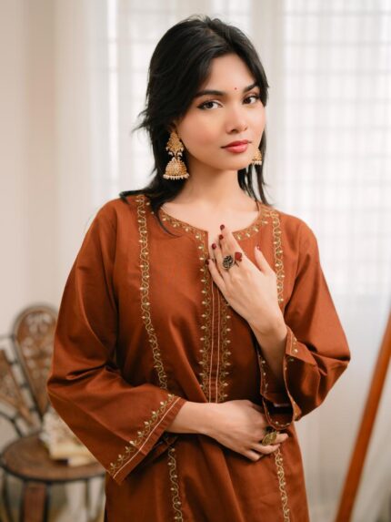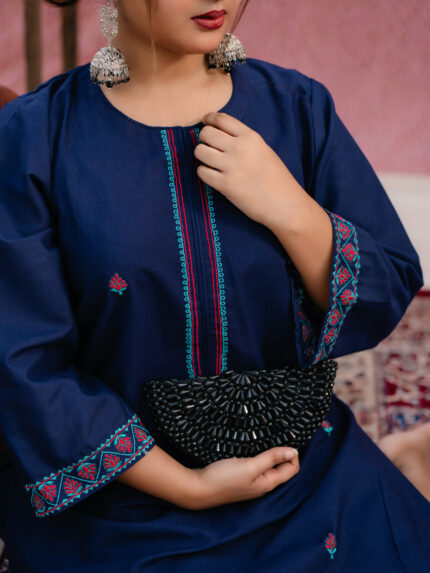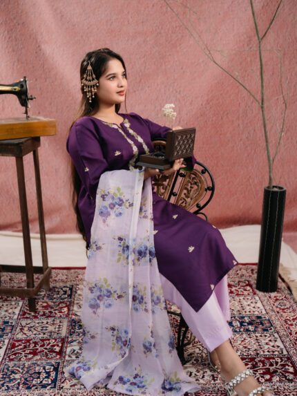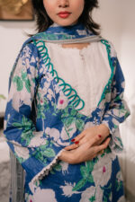 Kurti is made of Light-weighted  Lawn cotton with Digital print . Pant is made of  Kashmiri cotton with lace work. The orna is made of pure cotton with Digital print.