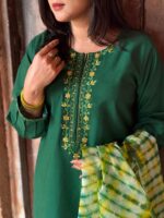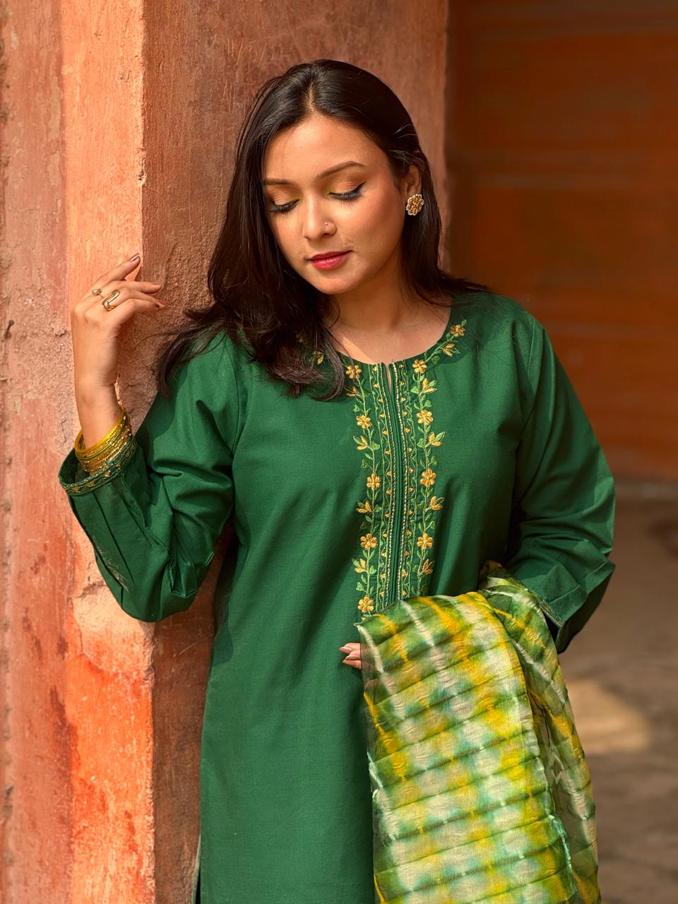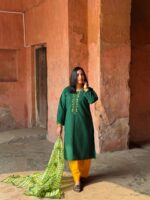 Kurti is made of Kashmiri cotton with embroidery work. Pant is made of Kashmiri cotton with embroidery work . The orna is made of organza with Batik work.