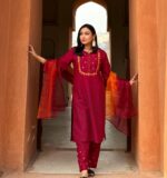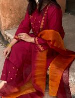 Kurti is made of Kashmiri cotton with embroidery work. Pant is made of Kashmiri cotton with embroidery work . The orna is made of organza with shade.