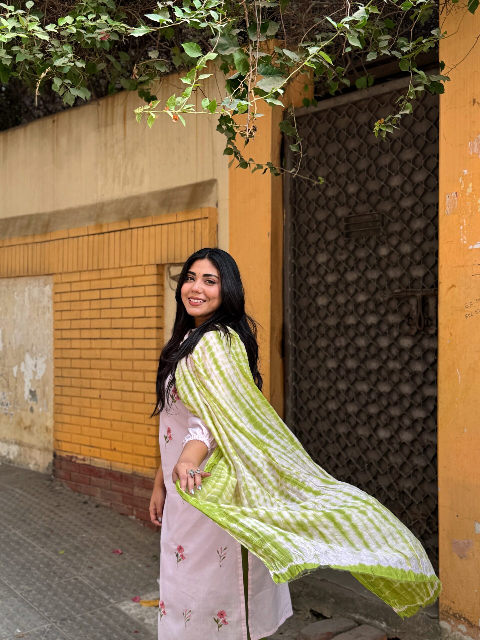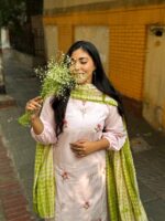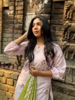 Kurti is made of Kashmiri cotton with embroidery work . Pant is made of Purwe cotton . The orna is made of Silk cotton with tye-dye.