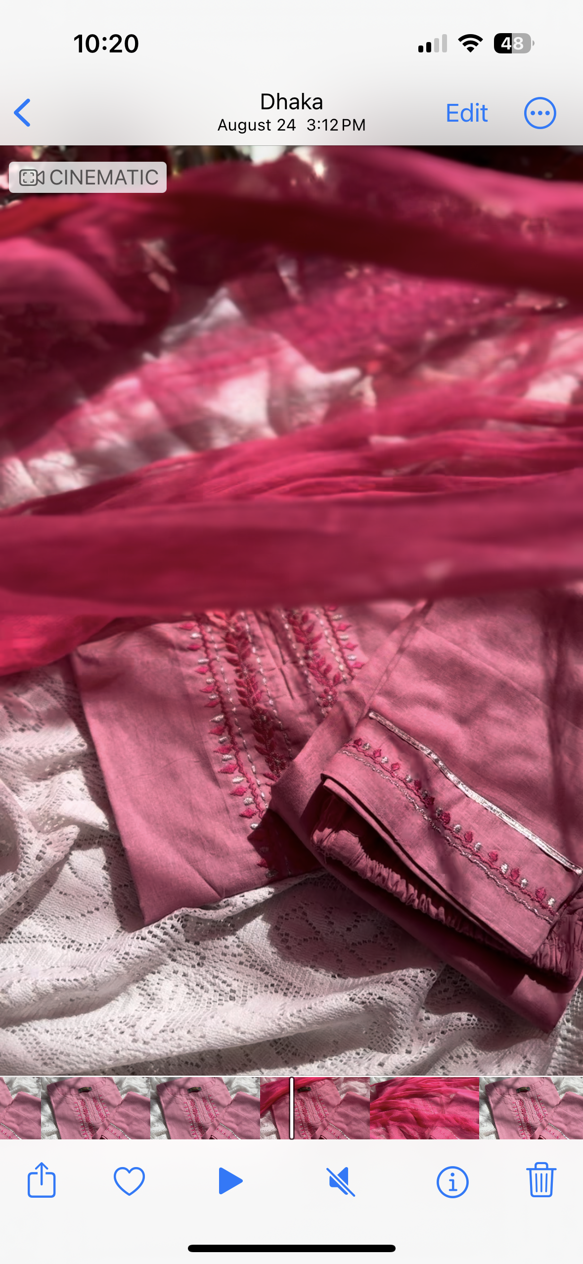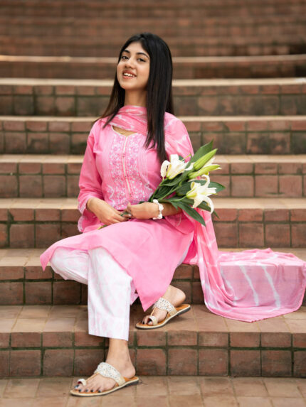 Kurti is made of Pure cotton with embroidered design. Pant is made of Pure cotton with embroidery work . The orna is made of semi pure georgette .