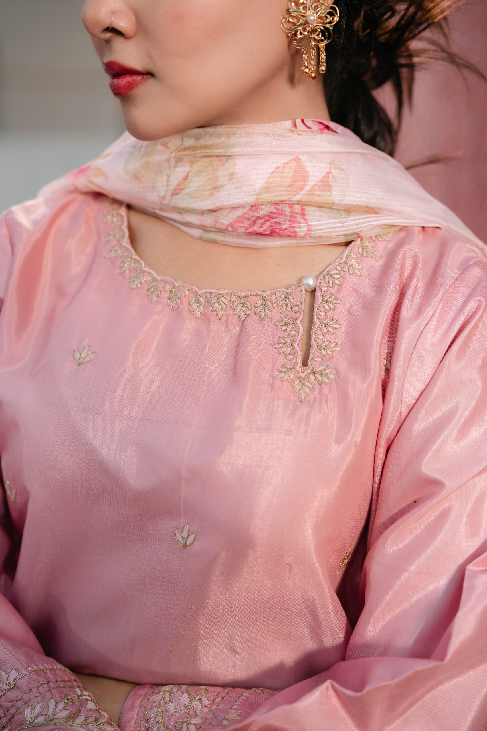 Kurti is made of Kashmiri Silk  with embroidery work and kod work. Pant is made of Kashmiri silk . The orna is made of soft Organza with digital print and Self work.