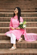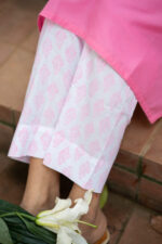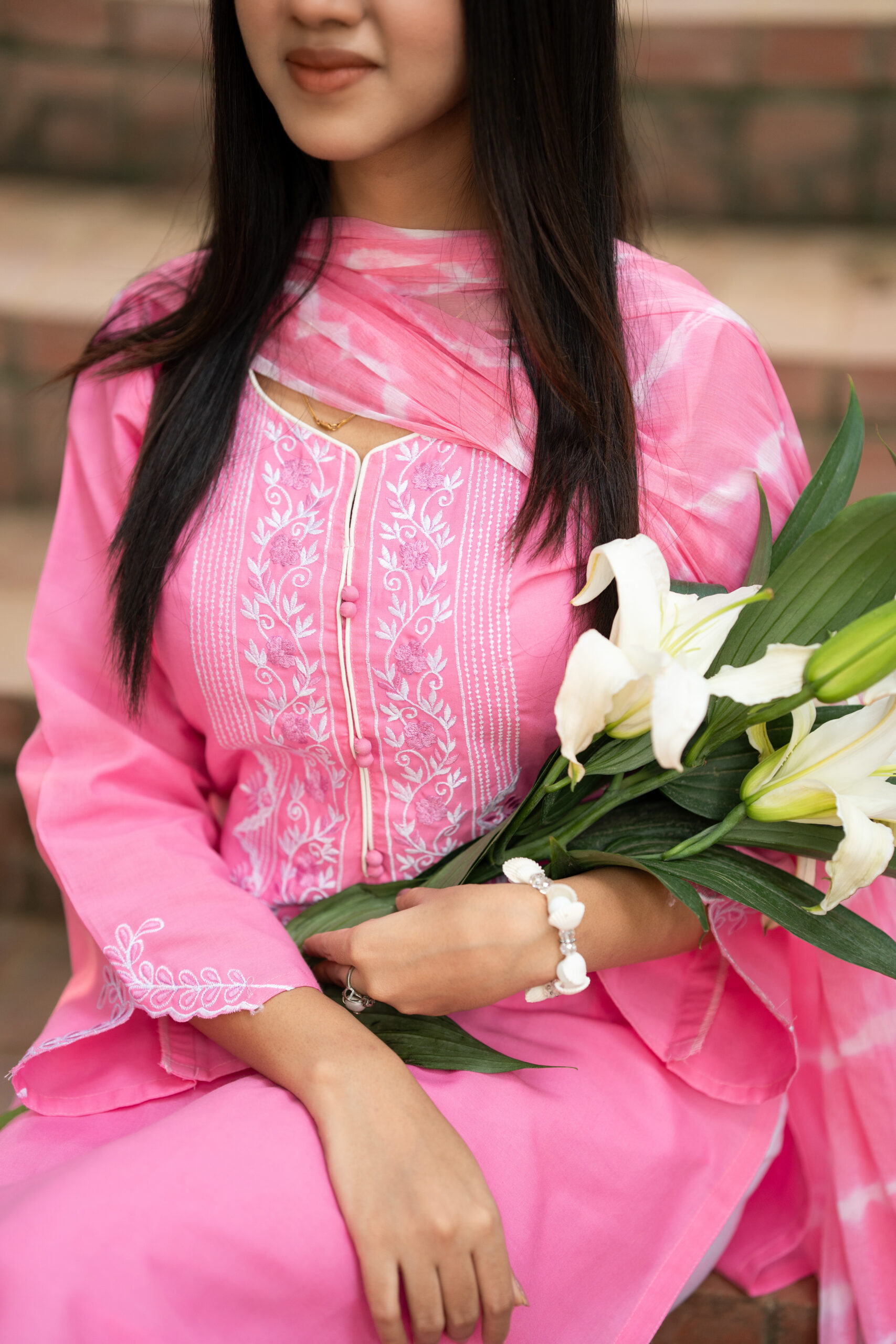 Kurti is made of Kashmiri cotton with embroidered design. Pant is made of Kashmiri cotton with hand block . The orna is made of semi pure georgette with Batik work.