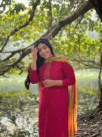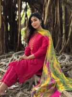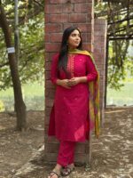 Kurti is made of Kashmiri cotton with embroidery work . Pant is made of Kashmiri cotton with embroidery work . The orna is made of semi pure georgette with Batik work.