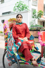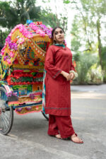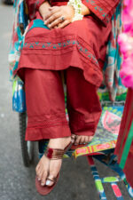 Kurti is made of pure slab cotton with embroidery work. Pant is made of pure slab cotton with lace work . The orna is made of semi pure georgette with batik.