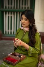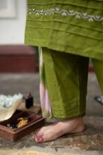 Kurti is made of pure slab cotton with embroidery work. Pant is made of pure slab cotton with lace work. The orna is made of semi pure georgette with batik work.
