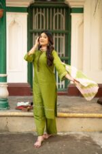 Kurti is made of pure slab cotton with embroidered design. Pant is made of slab cotton with lace work (Palazzo style). The orna is made of semi pure georgette with batik work.