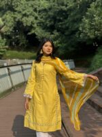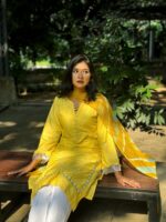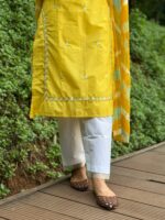 Kurti is made of Kashmiri cotton with embroidered design. Pant is made of Kashmiri cotton with embroidery work . The orna is made of semi pure georgette with Batik work.